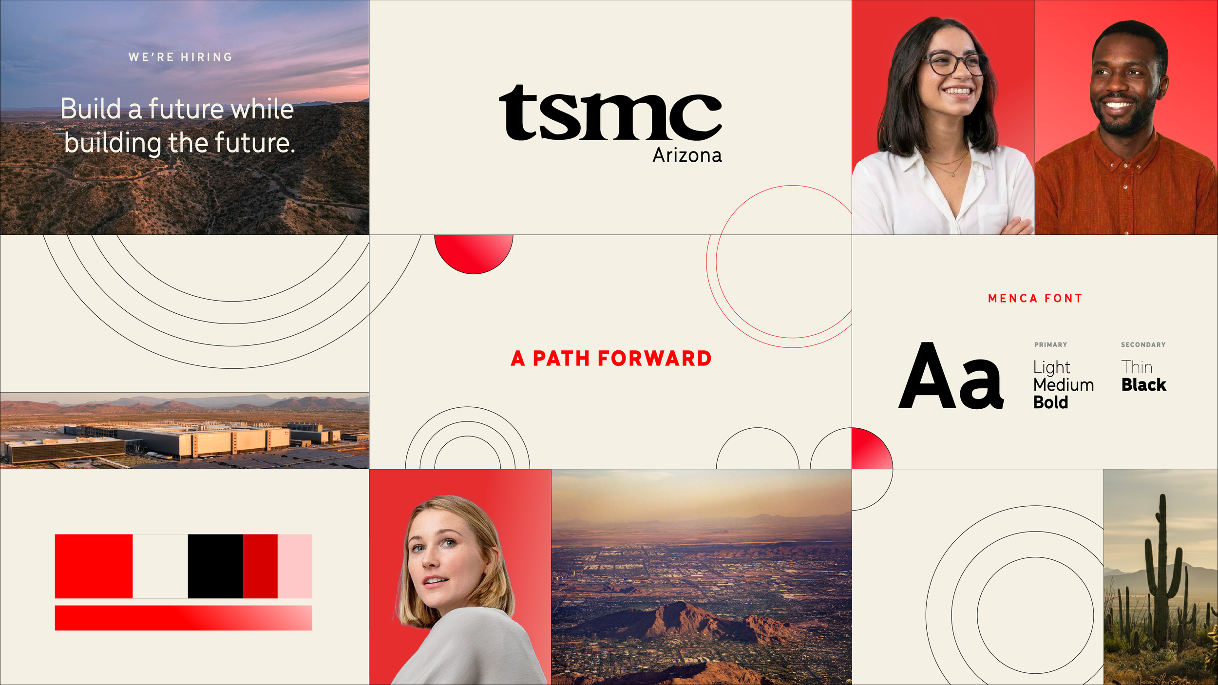 Created a spinoff of TSMC’s corporate color palette by adding beige, dark red, pink, and a gradient. These additions create a bit of warmth to complement the landscapes of Arizona while still maintaining pop.